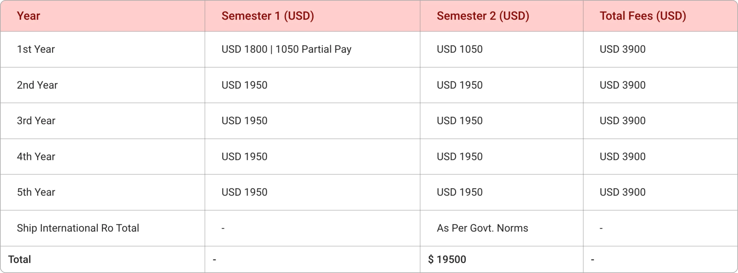 | Year | Semester 1 (USD) | Semester 2 (USD) | Total Fees (USD) |